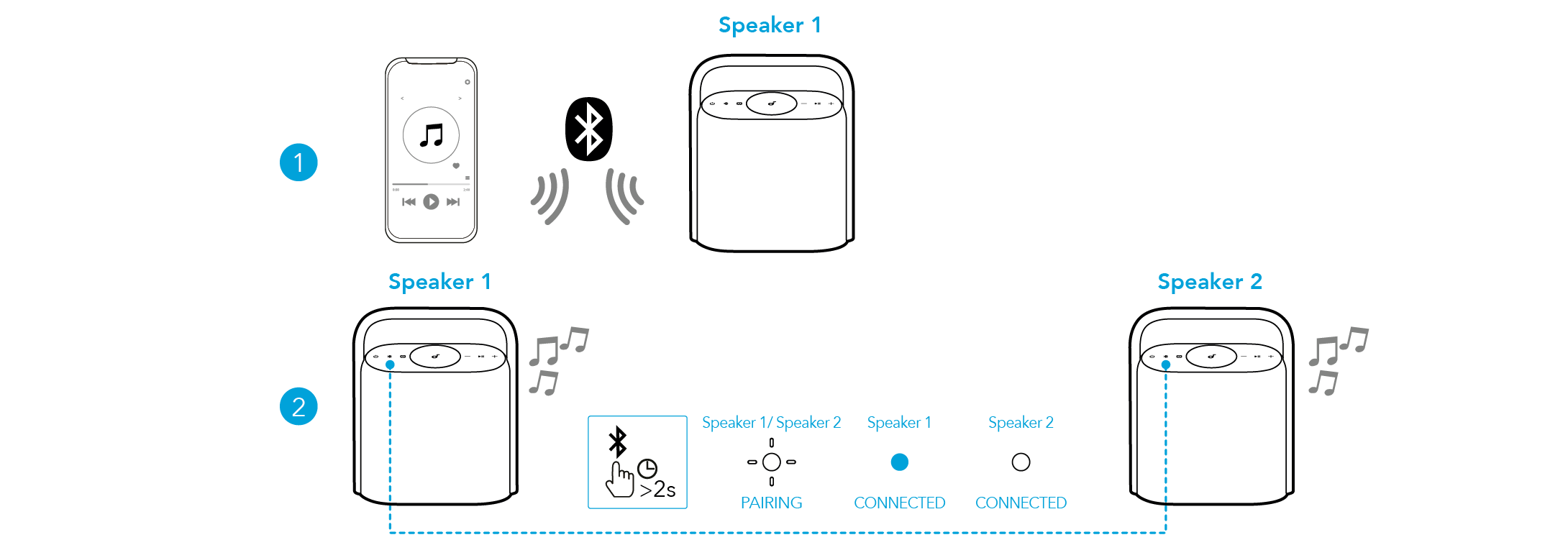 Con un altavoz conectado a un teléfono inteligente, presione y mantenga presionado el botón Bluetooth durante 2 segundos en dos altavoces para ingresar al modo de emparejamiento TWS.