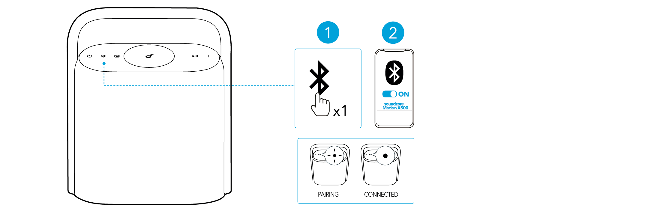 Presione el botón Bluetooth para ingresar al modo de emparejamiento Bluetooth, luego seleccione "soundcore Motion X500" de la lista de Bluetooth para conectarse.