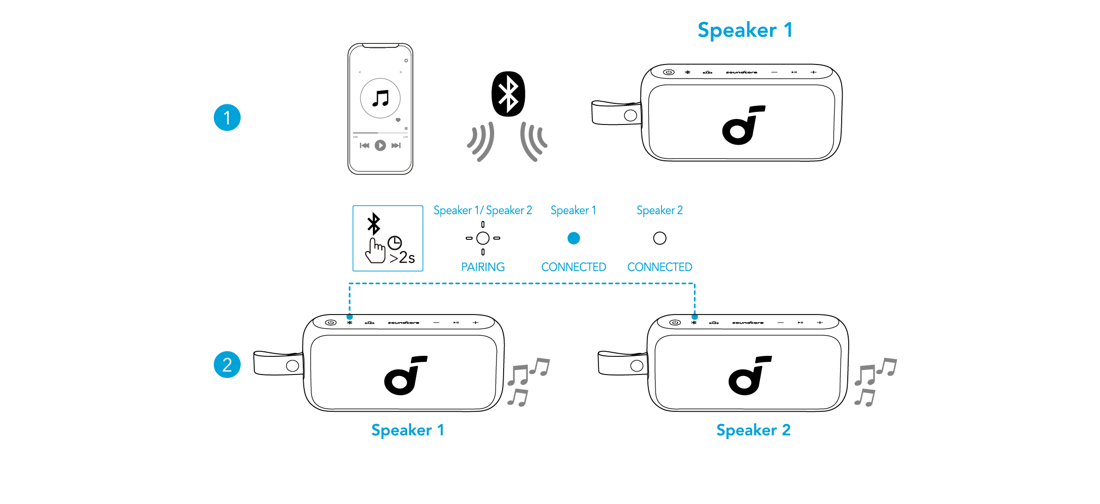 Dos altavoces soundcore idénticos pueden emparejarse entre sí para obtener sonido estéreo. Ambos altavoces pueden reproducir el mismo audio (uno en el canal izquierdo y el otro en el canal derecho).