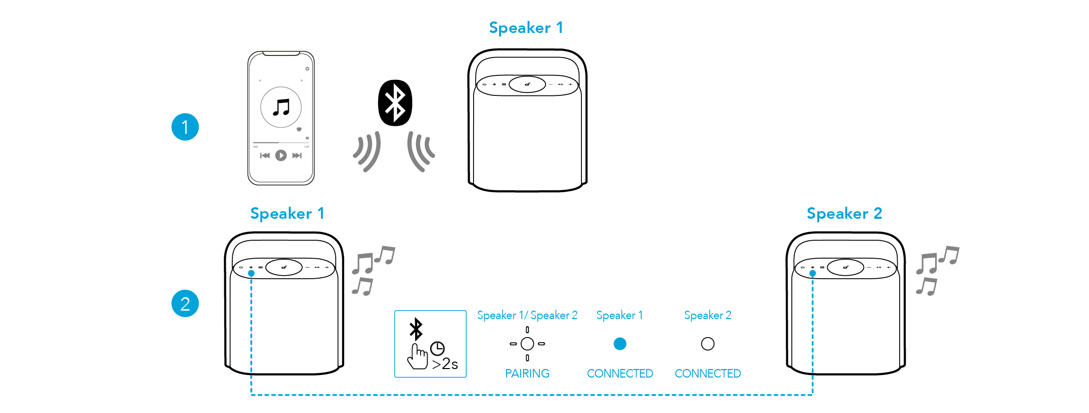 Yhdistä yksi kaiutin älypuhelimeen ja pidä Bluetooth-painiketta painettuna kahden kaiuttimen kohdalla 2 sekunnin ajan TWS-pariliitostilaan siirtymiseksi.