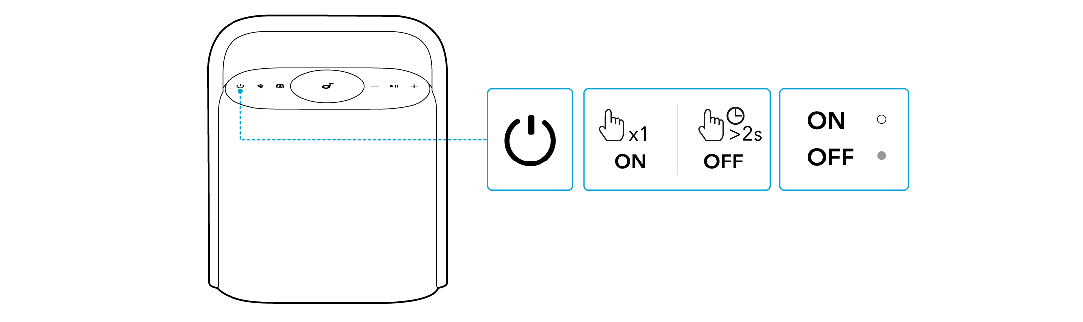 - Kun kytket virran kaiuttimeen, se muodostaa yhteyden viimeksi yhdistettyyn laitteeseesi, mikäli kyseinen laite on käytettävissä Bluetooth-kantaman alueella. Jos ei ole, siirry Bluetooth-parinmuodostustilaan painamalla Bluetooth-painiketta.