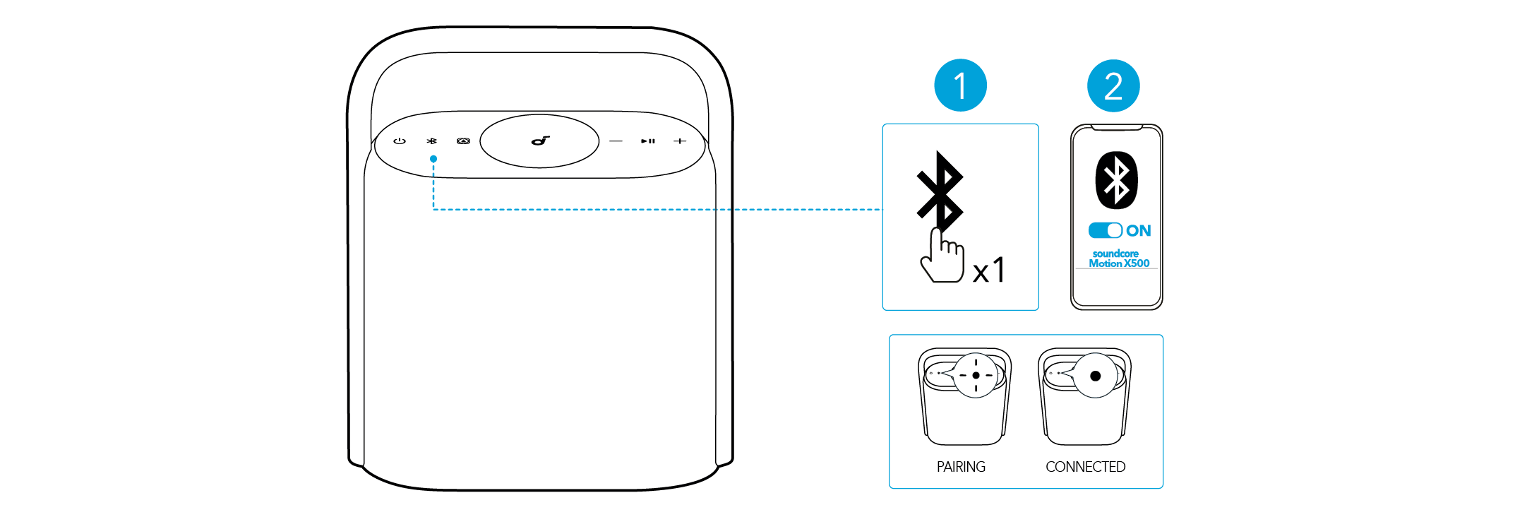 Paina Bluetooth-painiketta siirtyäksesi Bluetooth-pariliitostilaan ja valitse sitten "soundcore Motion X500" Bluetooth-luettelosta yhdistääksesi.
