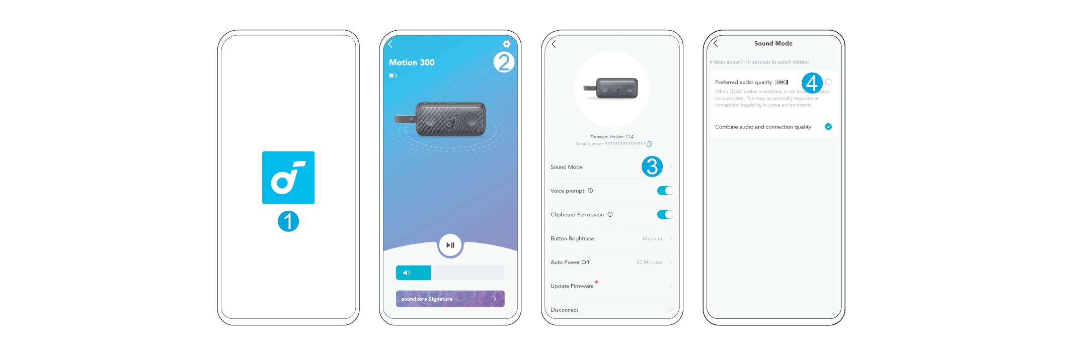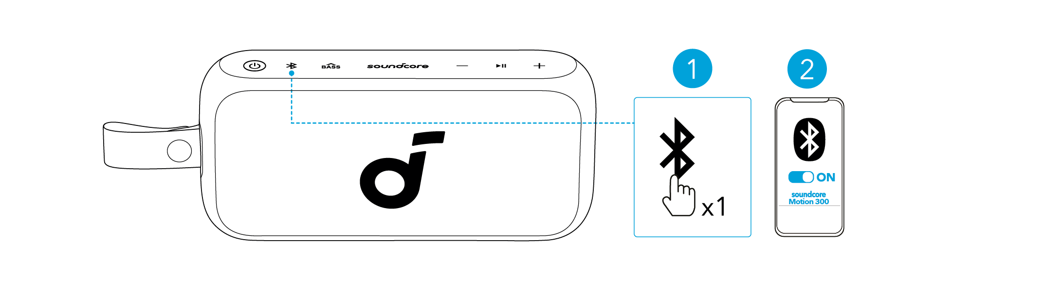 Paina Bluetooth-painiketta siirtyäksesi Bluetooth-pariliitostilaan, valitse sitten "soundcore Motion 300" Bluetooth-luettelosta yhdistääksesi.