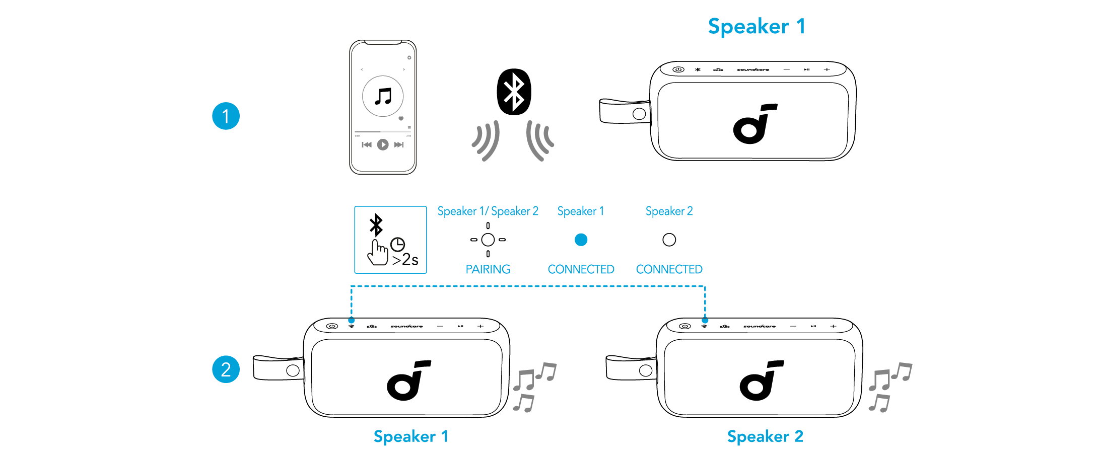 Kaksi identtistä soundcore-kaiutinta voidaan yhdistää toisiinsa stereokaiuttimen muodostamiseksi. Molemmat kaiuttimet voivat toistaa samaa ääntä (yksi vasenta kanavaa ja toinen oikeaa kanavaa).