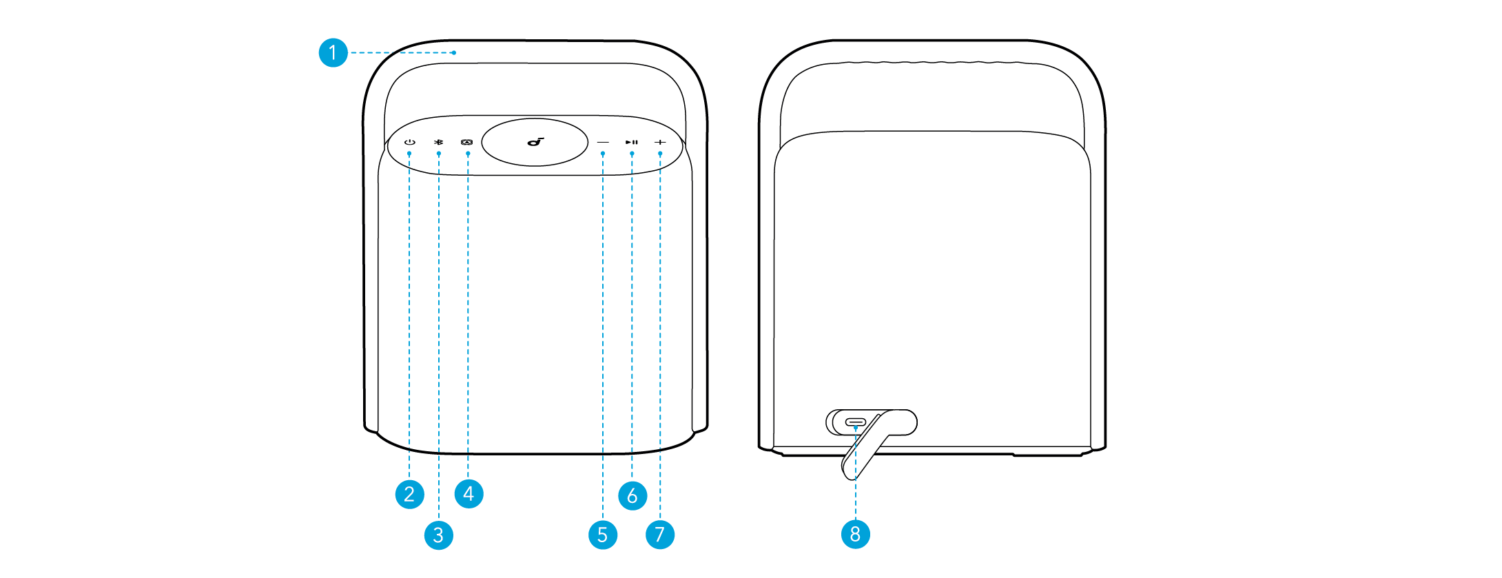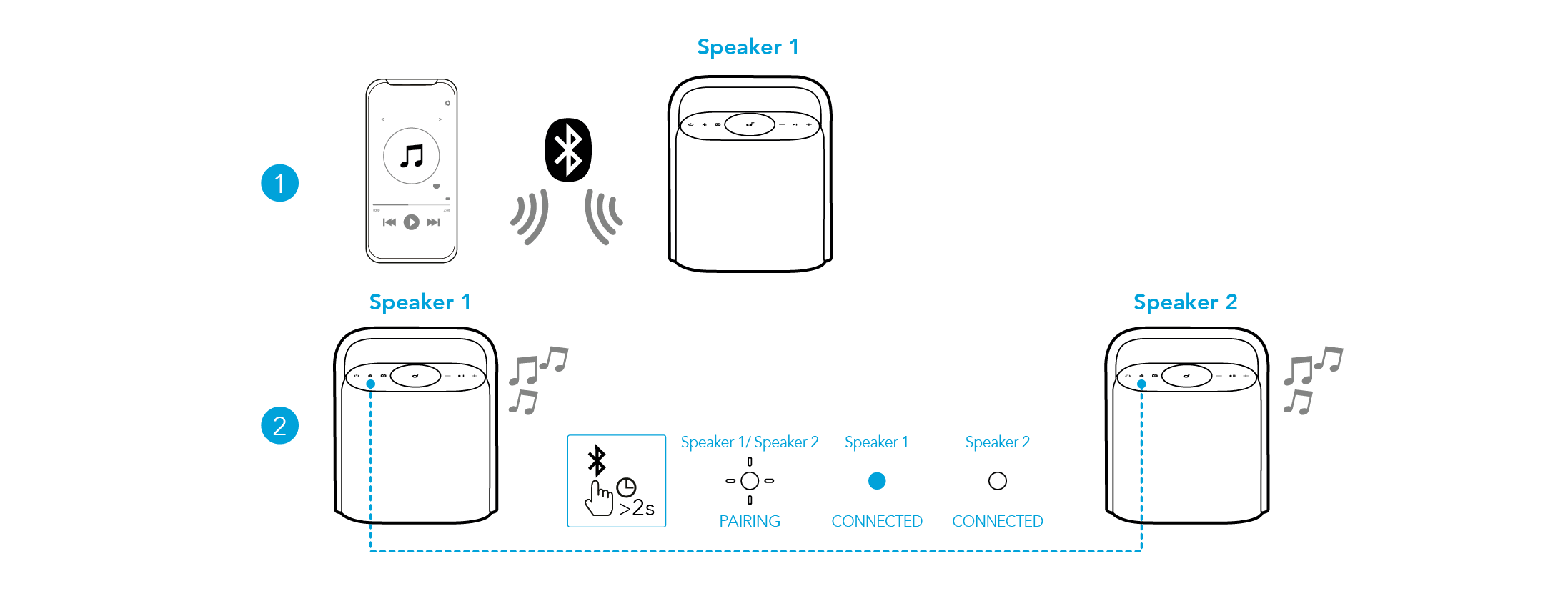 Dwa identyczne głośniki soundcore mogą się ze sobą połączyć w celu uzyskania dźwięku stereo. Oba głośniki mogą odtwarzać ten sam materiał audio (jeden jako kanał lewy, a drugi jako kanał prawy).