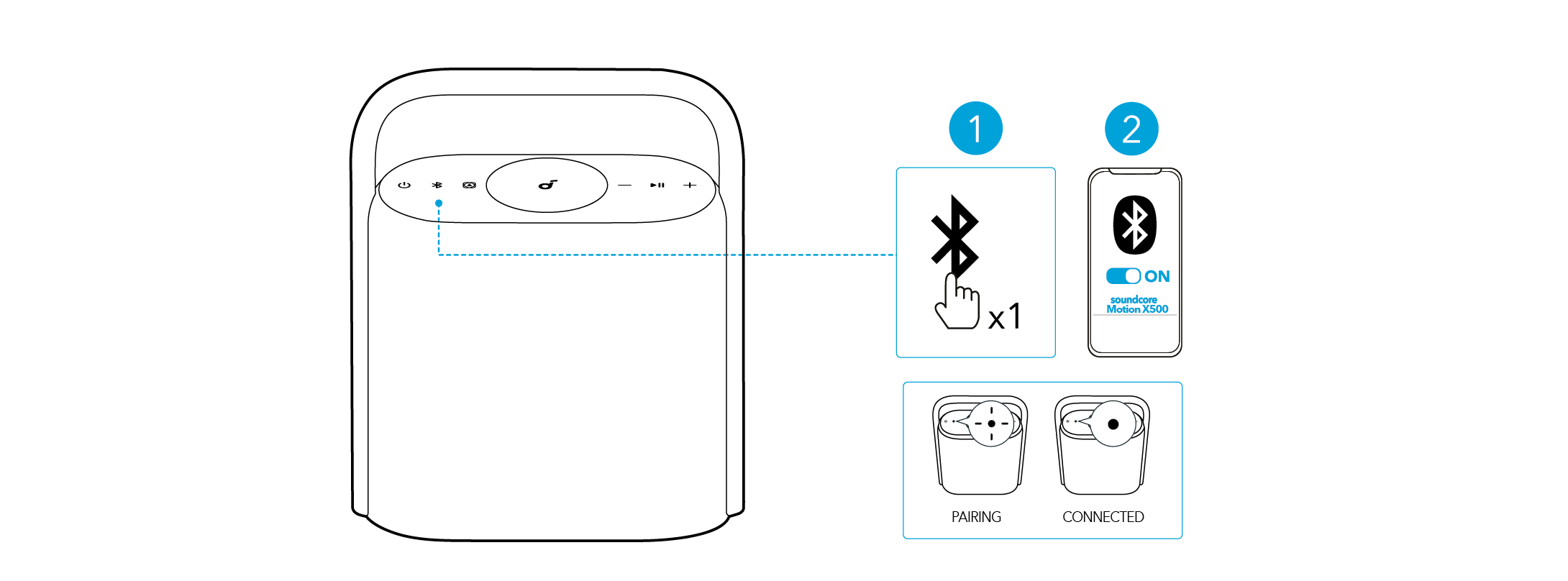 Naciśnij przycisk Bluetooth, aby wejść w tryb parowania Bluetooth, a następnie wybierz "soundcore Motion X500" z listy Bluetooth, aby połączyć.