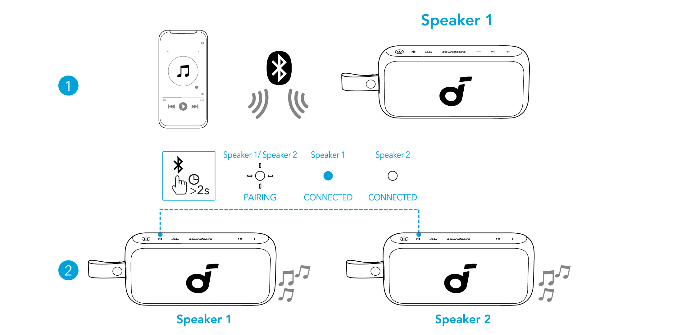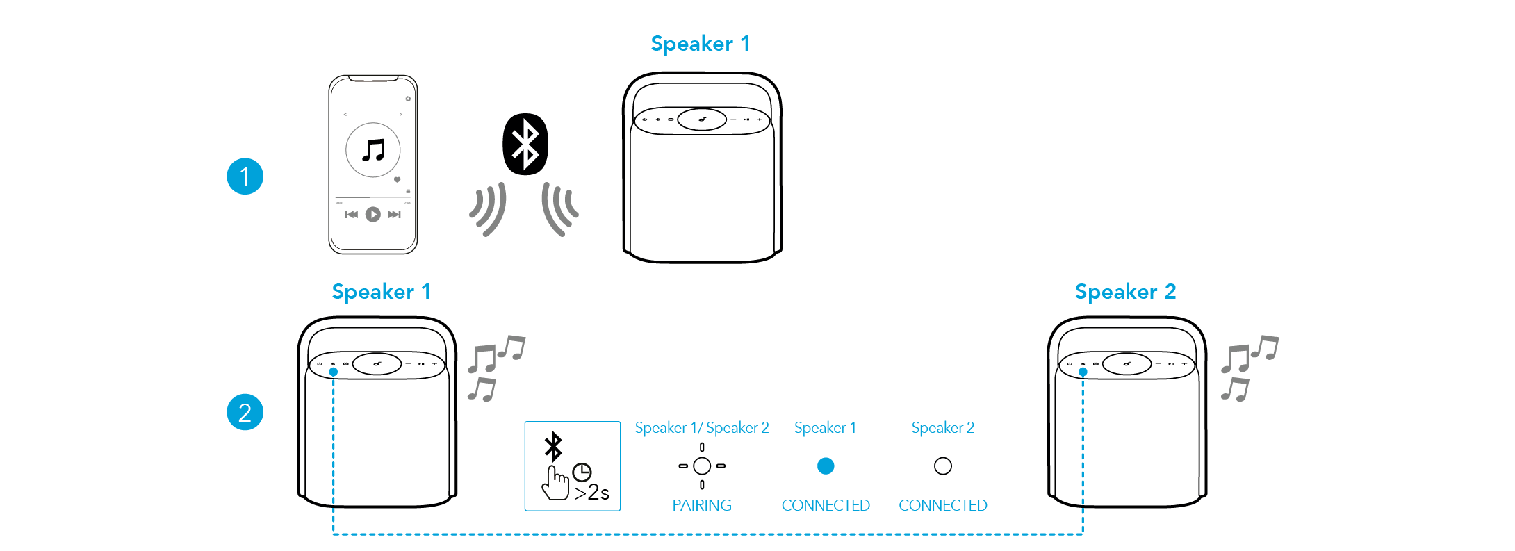 Med en högtalare ansluten till en smartphone, tryck och håll ned Bluetooth-knappen i 2 sekunder på två högtalare för att komma in i TWS-parningsläge.