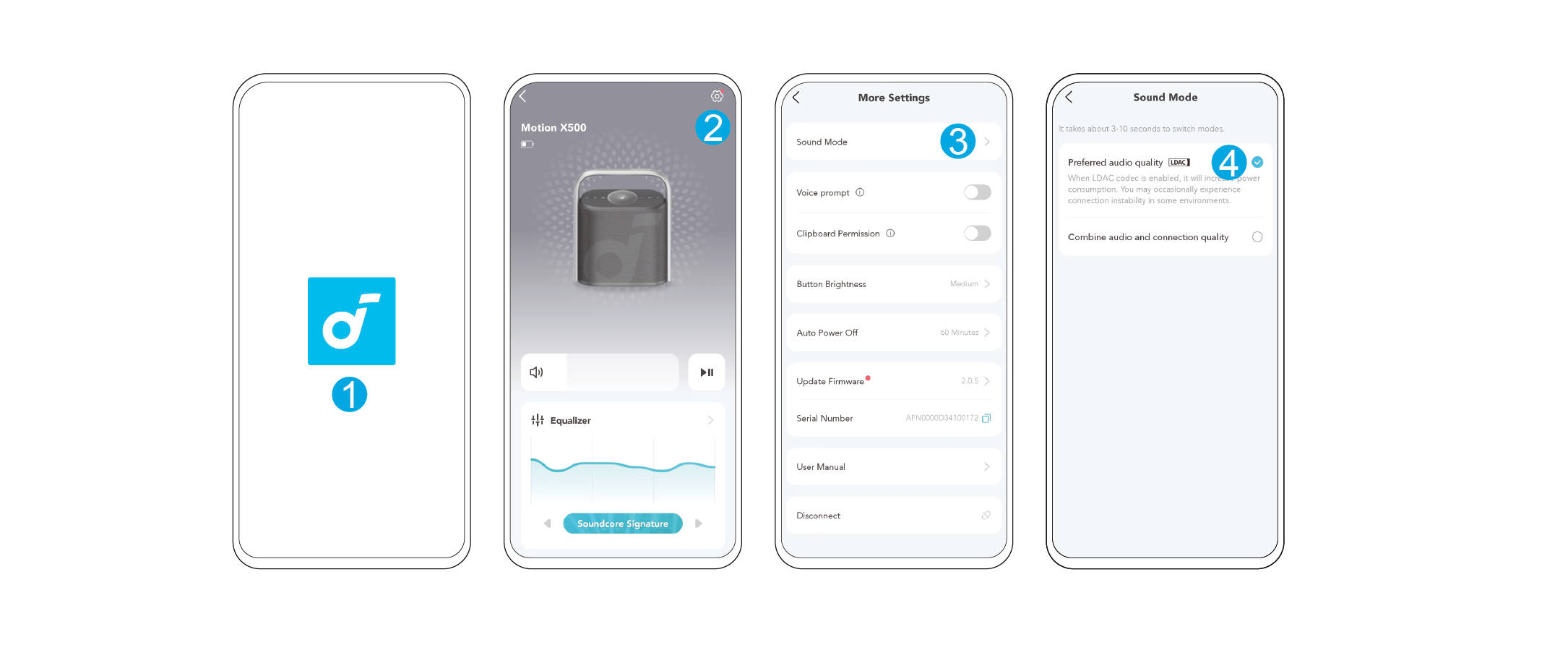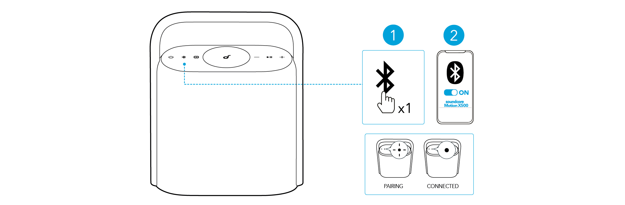 Tryck på Bluetooth-knappen för att komma in i Bluetooth-parningsläge, välj sedan "soundcore Motion X500" från Bluetooth-listan för att ansluta.