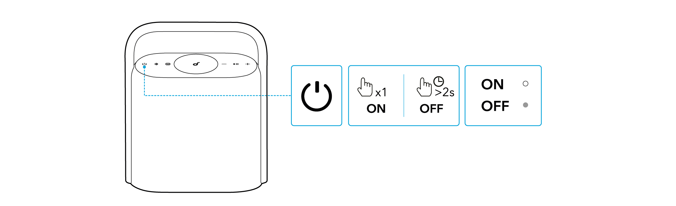 - Varje gång du aktiverar högtalaren kommer den automatiskt att ansluta till den senast anslutna enheten om denna finns tillgänglig inom räckvidden för Bluetooth. Annars trycker du på Bluetooth-knappen för att öppna Bluetooth-parkopplingsläget.