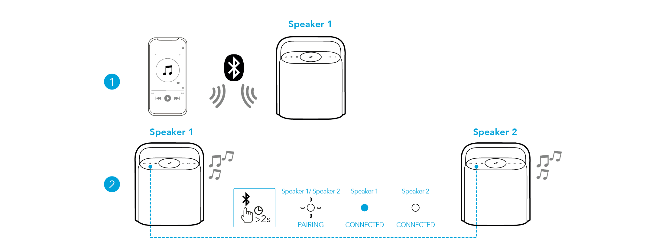 Bir hoparlörün akıllı telefona bağlı olduğu durumda, TWS eşleştirme moduna girmek için iki hoparlörde Bluetooth düğmesine 2 saniye basılı tutun.
