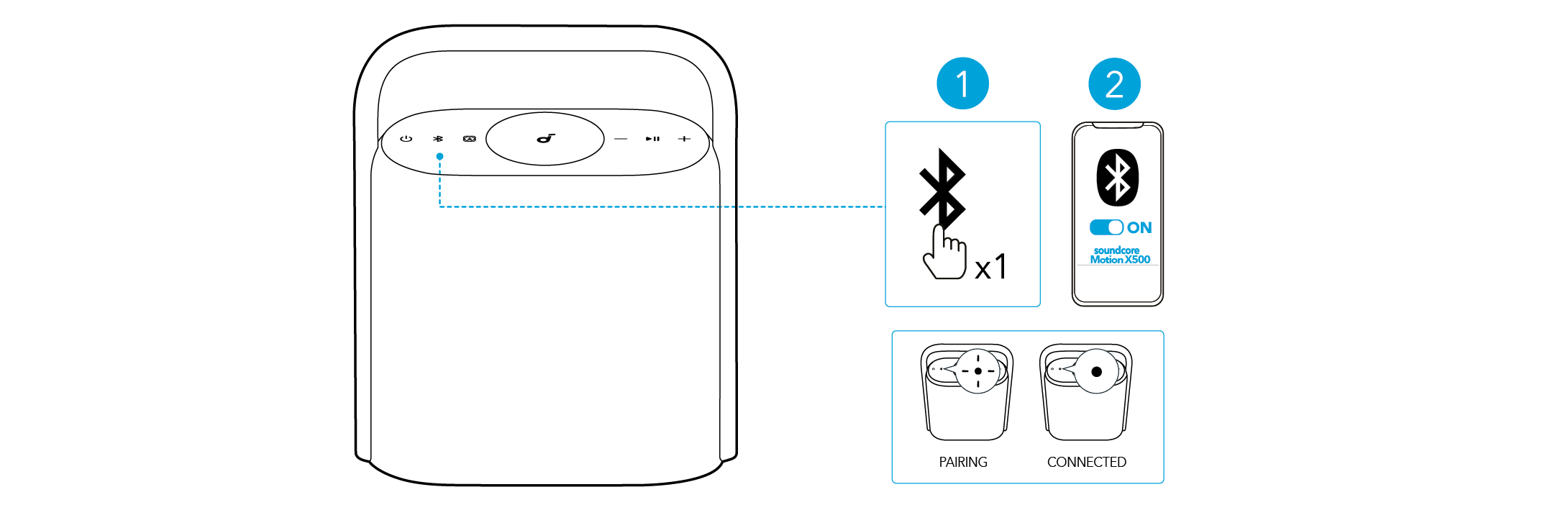 Bluetooth eşleştirme moduna girmek için Bluetooth düğmesine basın, ardından Bluetooth listesinden "soundcore Motion X500" seçerek bağlanın.