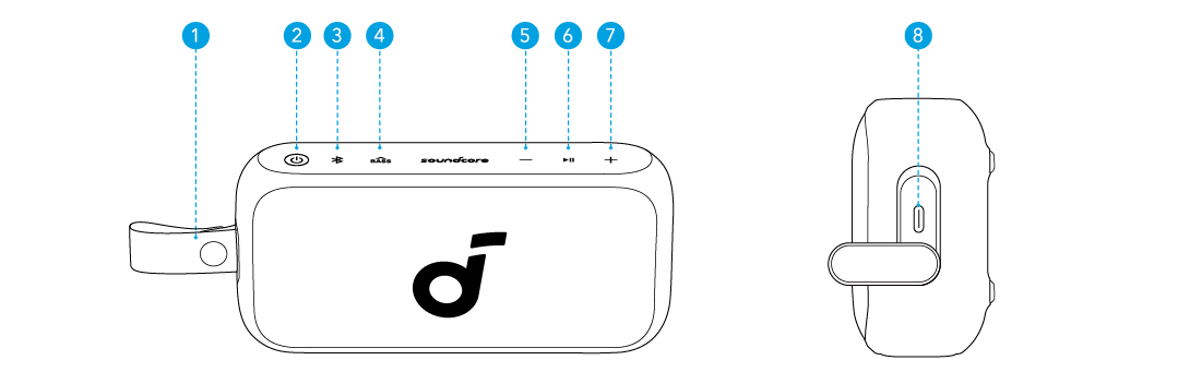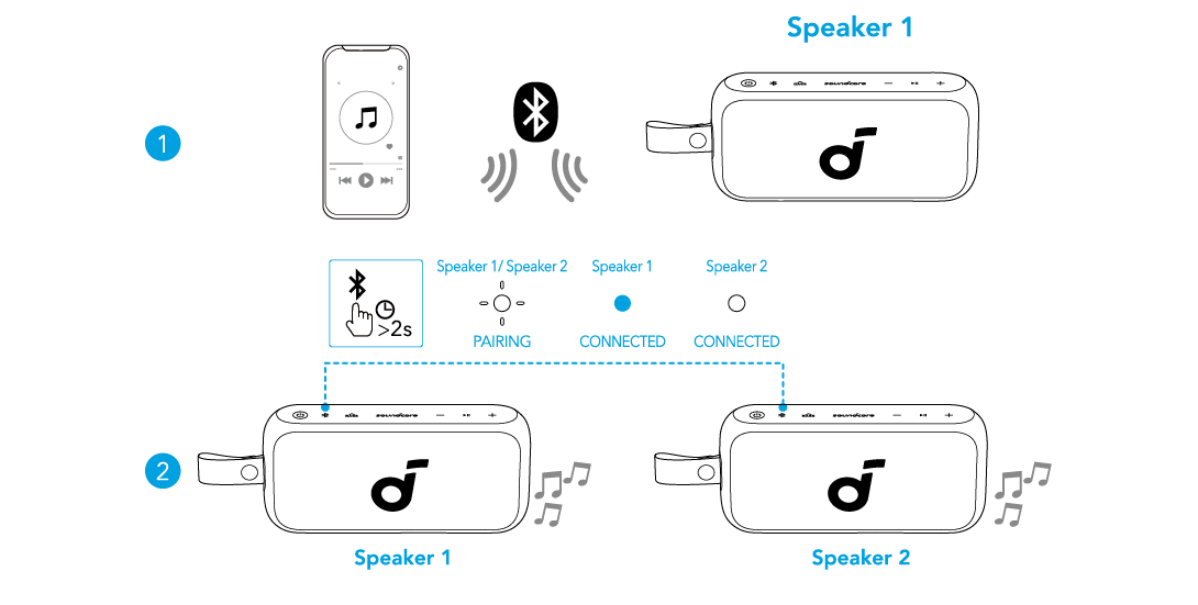 两个相同的soundcore音箱可以配对,以获得立体声声音。 两个音箱可以播放同一音频(一个作为左声道,另一个作为右声道)。