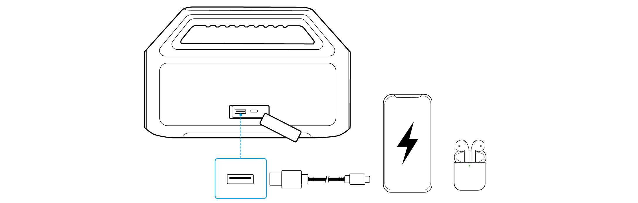 - يمكن لمكبر الصوت هذا تشغيل الموسيقى على جهاز محمول واحد فقط في كل مرة. للتشغيل من جهاز متصل آخر، أوقف أولاً الجهاز النشط حاليًا مؤقتًا.