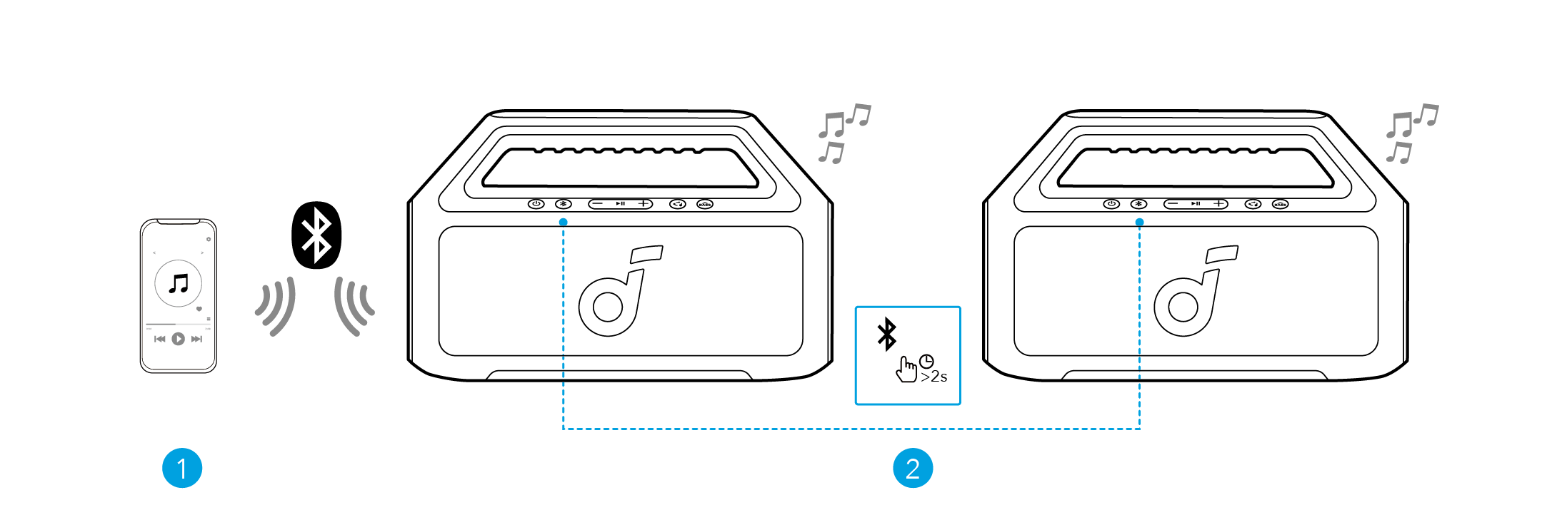 Kaksi identtistä soundcore-kaiutinta voidaan yhdistää toisiinsa stereokaiuttimen muodostamiseksi. Molemmat kaiuttimet voivat toistaa samaa ääntä (yksi vasenta kanavaa ja toinen oikeaa kanavaa).