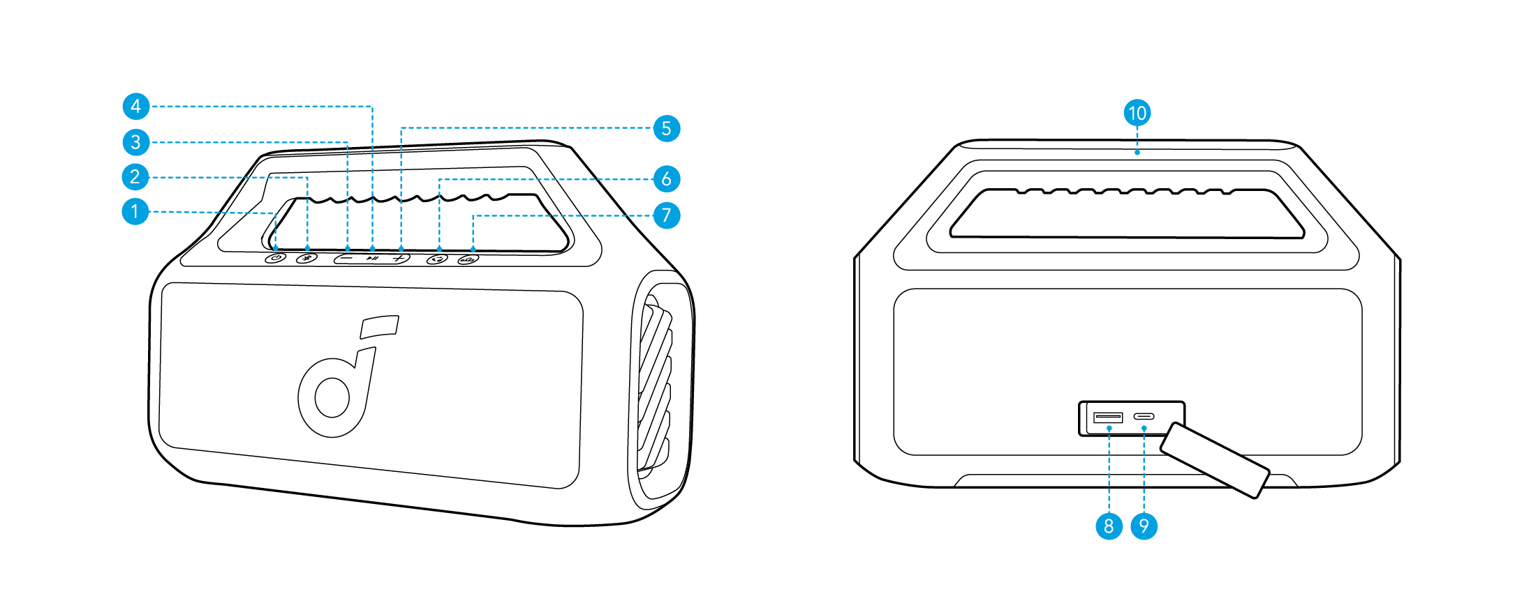 Avec un haut-parleur connecté à un smartphone, appuyez sur le bouton PartyCast sur jusqu'à 100 haut-parleurs soundcore avec la fonction PartyCast pour synchroniser l'audio et la lumière.