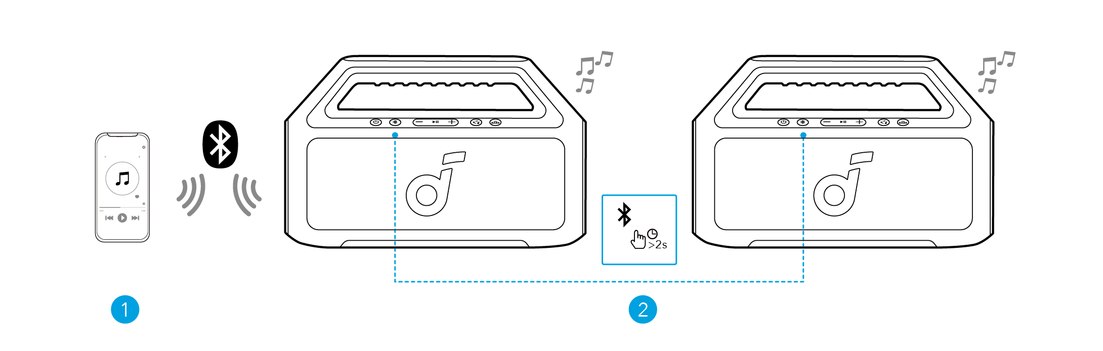 Avec un haut-parleur connecté à un smartphone, appuyez sur le bouton Bluetooth pendant 2 secondes sur deux haut-parleurs pour entrer en mode de couplage TWS.