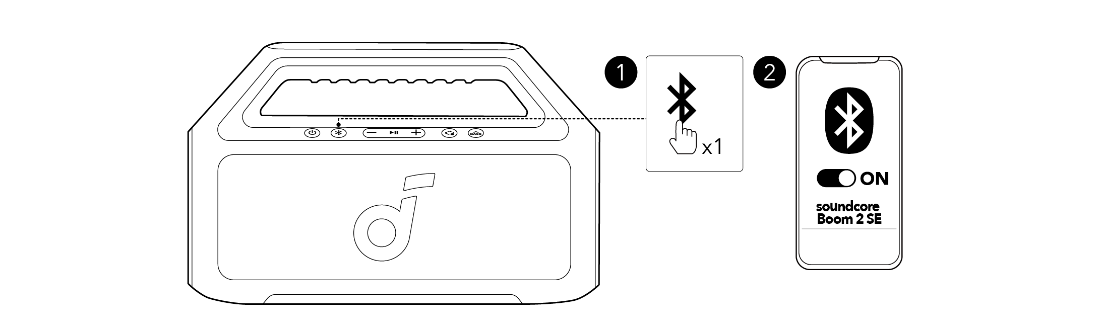 Appuyez sur le bouton Bluetooth pour entrer en mode de jumelage Bluetooth, puis sélectionnez "soundcore Boom 2 SE" dans la liste Bluetooth pour vous connecter.
