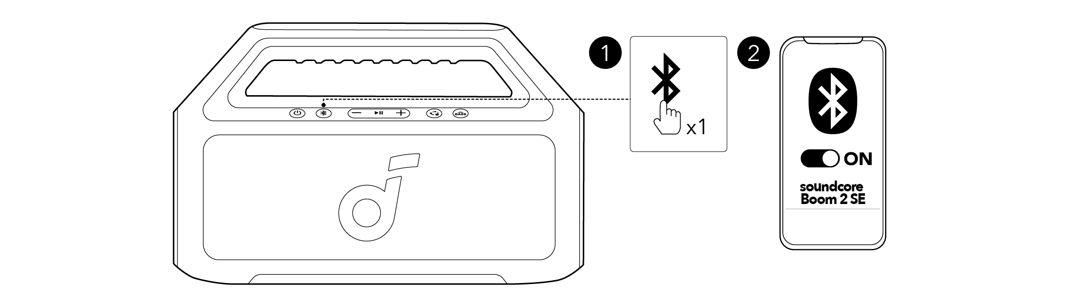 블루투스 버튼을 눌러 블루투스 페어링 모드로 진입한 후, 블루투스 목록에서 "soundcore Boom 2 SE"를 선택하여 연결하세요.