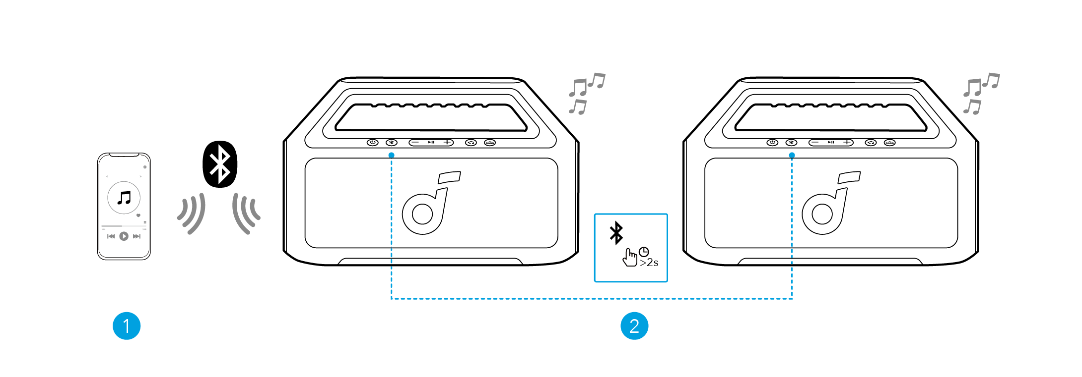 Met één luidspreker aangesloten op een smartphone, druk en houd de Bluetooth-knop gedurende 2 seconden ingedrukt op twee luidsprekers om de TWS-koppelingsmodus in te voeren.