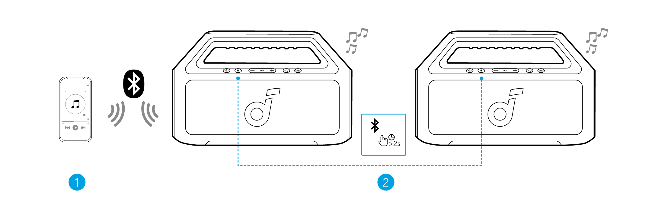 Med én høyttaler tilkoblet en smarttelefon, trykk og hold Bluetooth-knappen i 2 sekunder på to høyttalere for å gå inn i TWS-parringmodus.
