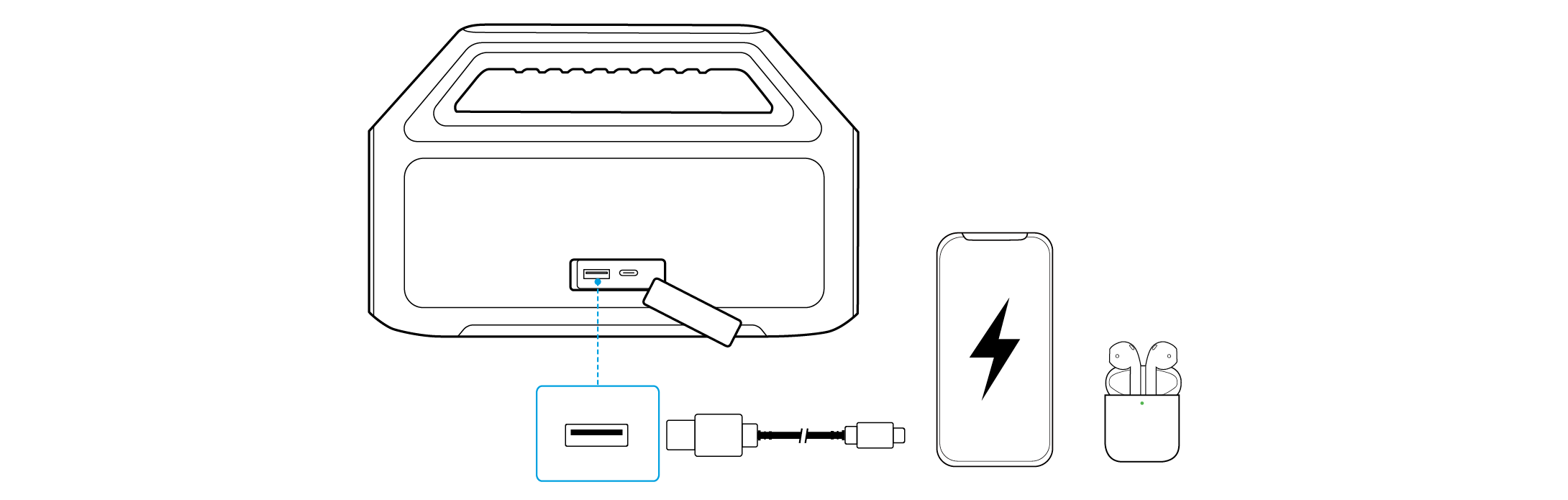 Bruk denne høyttaleren som en strømbank for å lade dine bærbare enheter eller tilbehør.