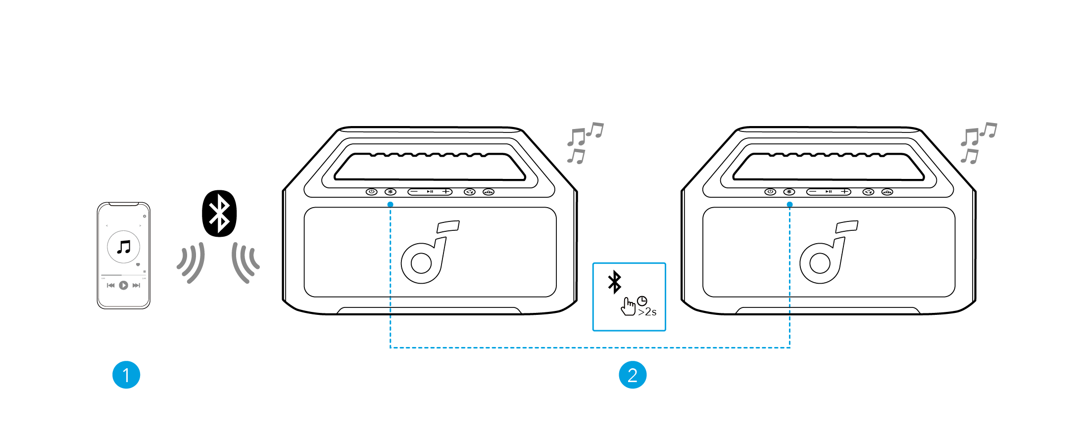 Подключите один динамик к смартфону, затем удерживайте кнопку Bluetooth на двух динамиках в течение 2 секунд, чтобы войти в режим сопряжения TWS.