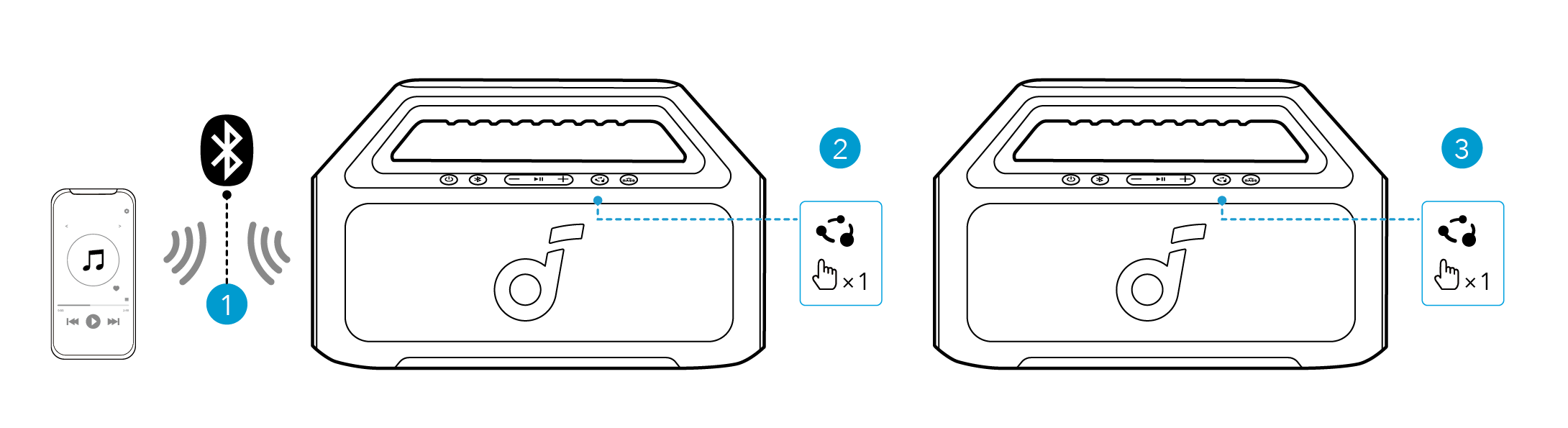 Два идентичных динамика soundcore могут соединяться друг с другом для стереозвука. Оба динамика могут воспроизводить одинаковый звук (один как левый канал, а другой — правый).