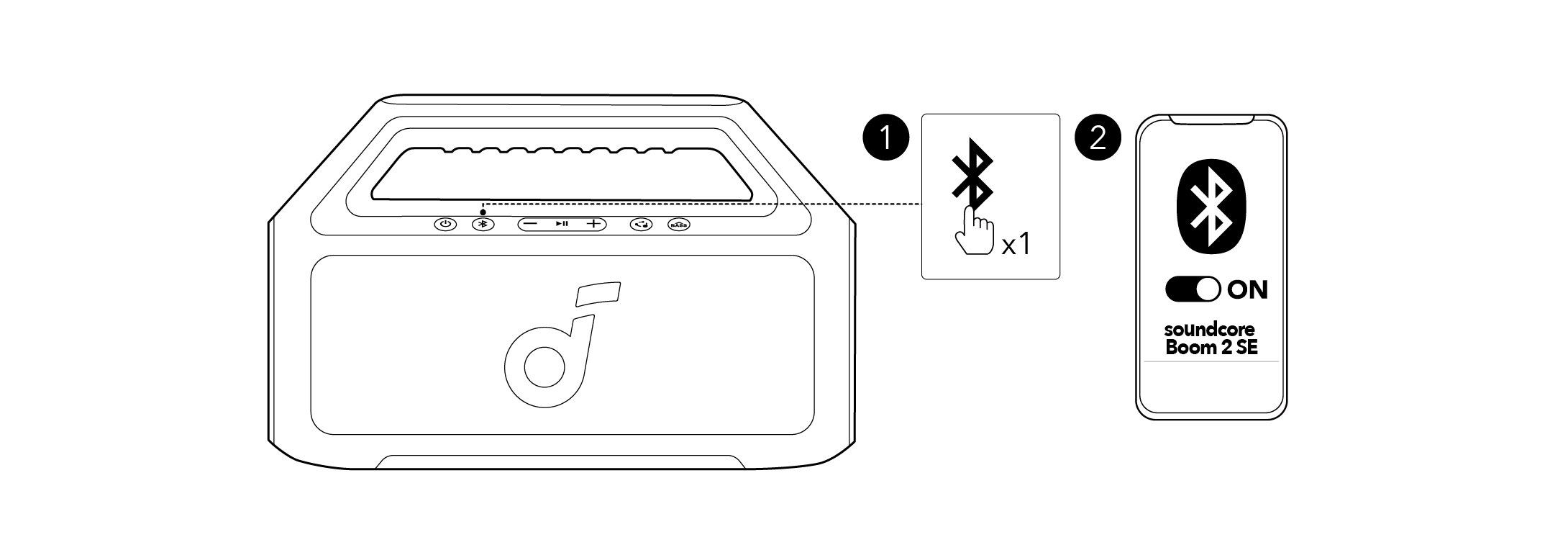 Нажмите кнопку Bluetooth, чтобы войти в режим сопряжения Bluetooth, затем выберите "soundcore Boom 2 SE" из списка Bluetooth для подключения.