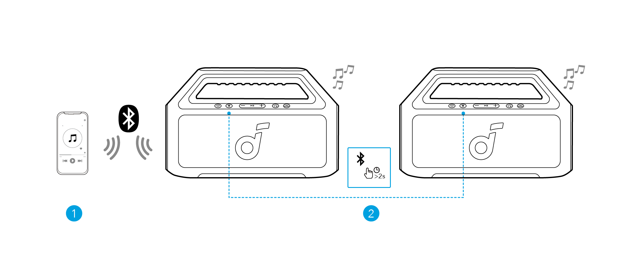 Med en högtalare ansluten till en smartphone, tryck och håll ned Bluetooth-knappen i 2 sekunder på två högtalare för att komma in i TWS-parningsläge.