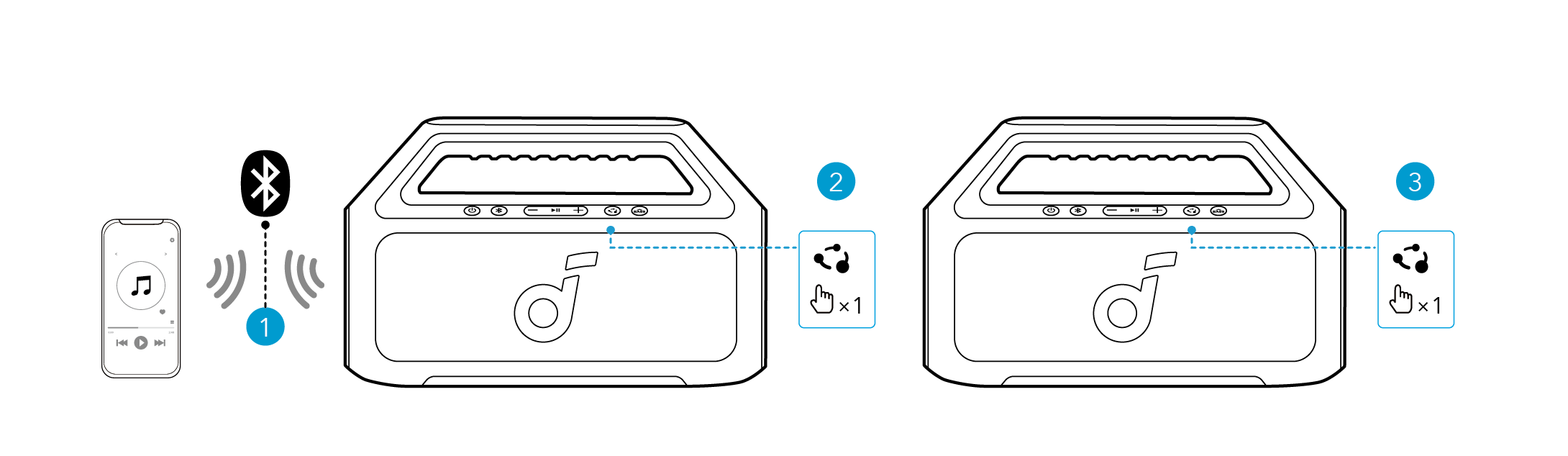 Med en högtalare ansluten till en smartphone, tryck på PartyCast-knappen på upp till 100 soundcore-högtalare med PartyCast-funktion för att synkronisera ljud och ljus.