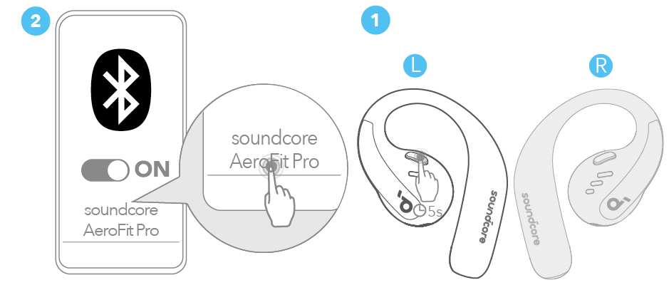بعد إزالة ملصقات العزل الموجودة على سماعتي الأذن، أعد سماعتي الأذن إلى علبة الشحن، ثم اضغط على الزر لتنشيط الاقتران عبر Bluetooth. يمكنك أيضًا إجراء الاقتران من خلال إغلاق غطاء العلبة وإعادة فتحه بمجرد عودة سماعتي الأذن إلى العلبة. ستدخل سماعتا الأذن تلقائيًا في وضع الاقتران عبر Bluetooth عند الاتصال لأول مرة. حدد "soundcore AeroFit Pro" في قائمة Bluetooth بجهازك للاتصال.