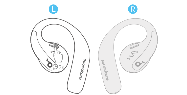 For å slå på en enkelt ørepropp, trykk og hold knappen til den tilsvarende øreproppen nede i 2 sekunder.