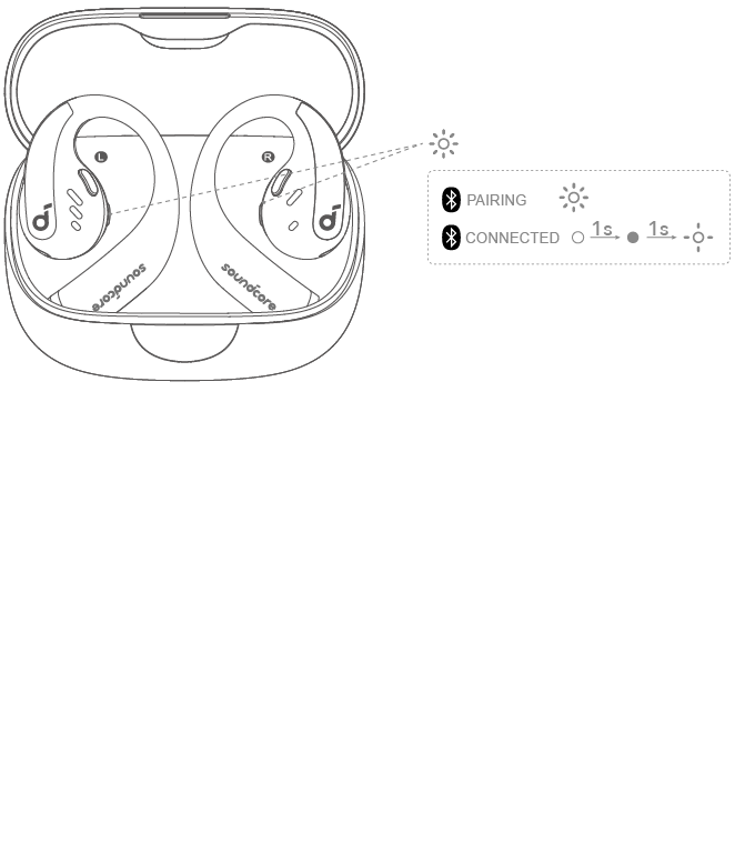 Når du parrer, vil LED-indikatorene inne i ladeetuiet begynne å blinke. Etter at sammenkoblingen er vellykket, vil LED-indikatorene på innsiden av ladeetuiet stå på i 1 sekund og deretter slukke. Deretter vil de begynne å blinke sakte.