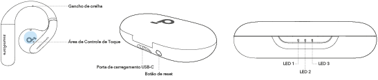 Retire os auriculares da sua caixa de carregamento, rode os ganchos auriculares ao longo das suas orelhas para ajustar o seu posicionamento.