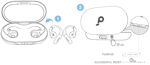 Primeiro, elimine o histórico de emparelhamento do seu dispositivo Bluetooth. Coloque os auriculares no estojo de carregamento e deixe o estojo aberto. Prima continuamente o botão de reset na caixa de carregamento por 10 segundos até que comece a observar o efeito de rolamento nos indicadores LED e posteriormente se iluminem por 5 segundos. Por esta altura, já foram repostas as configurações iniciais nos seus auriculares.