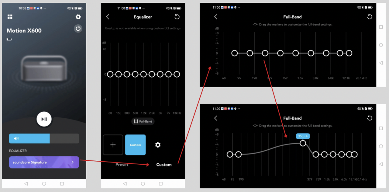 To customize the EQ, open the soundcore app and go to Equalizer > Custom > Full-Band. Then click any dot to expand the corresponding frequency band. Long press the dot and drag to customize the frequency.