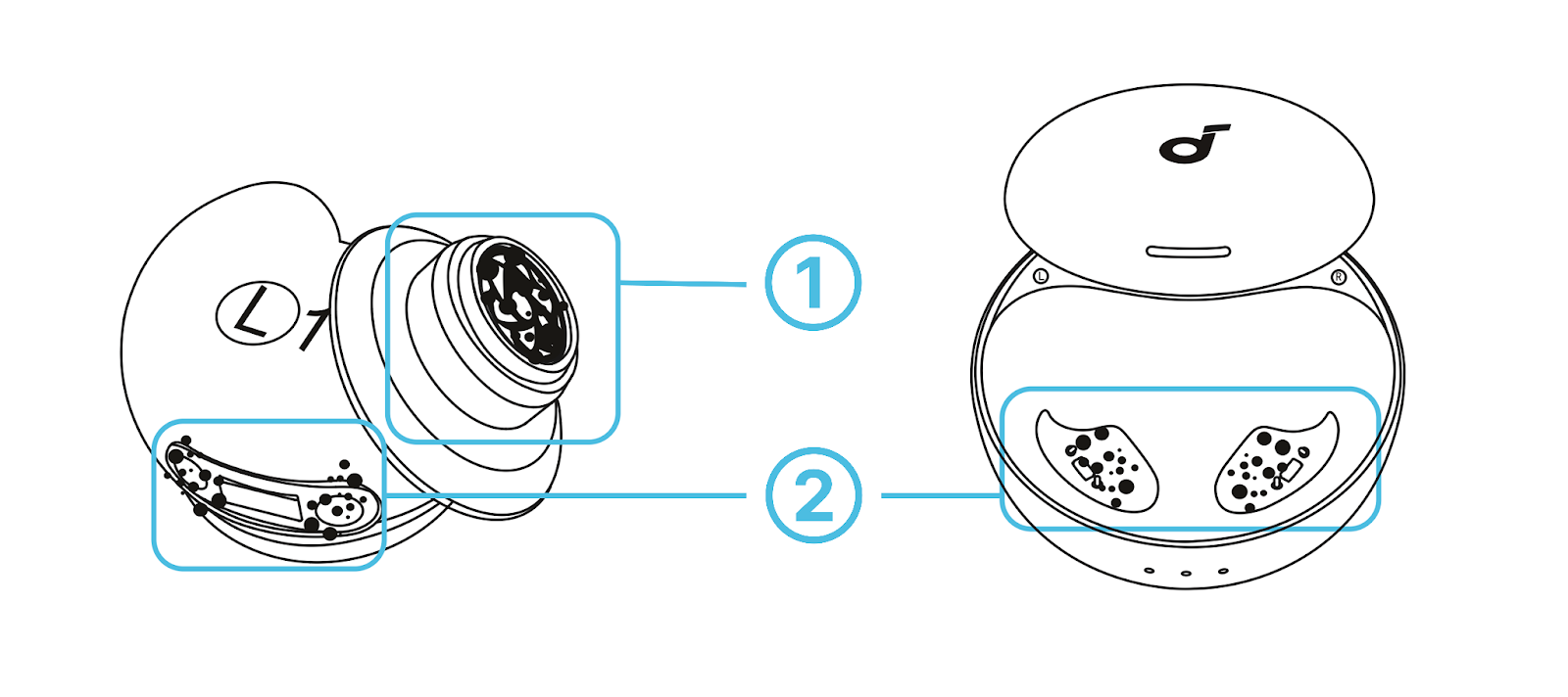 2. Use the same method to clean the charging contacts on the earbuds and inside the charging case (refer to ②).