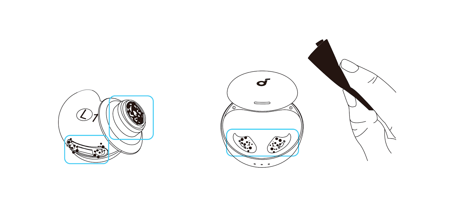 2. Use the same method to clean the charging contacts on the earbuds and inside the charging case.