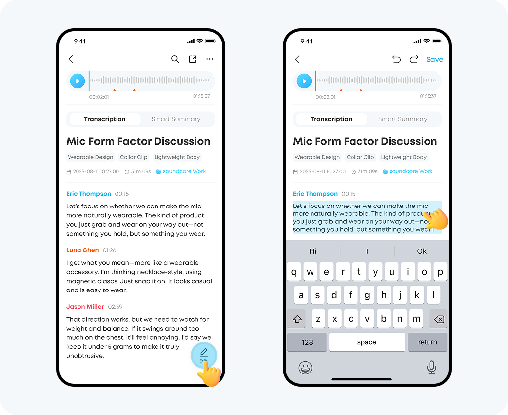 Click the "Edit" button in the lower right corner of the transcription page to modify the content; click any paragraph on the summary page to start editing.
