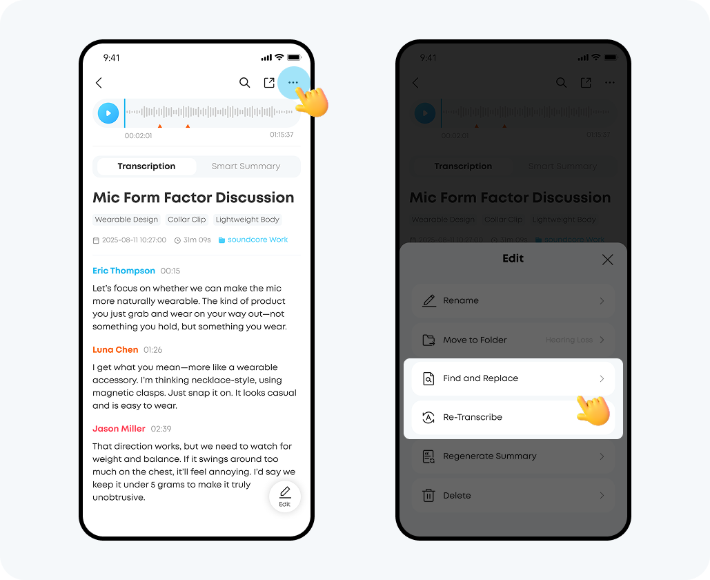 Go to the file details page, click the "···" button in the upper right corner, and then click the "Re-transcribe" or "Regenerate summary" button. Please note that re-generating will consume your transcription quota, so please use it as needed.