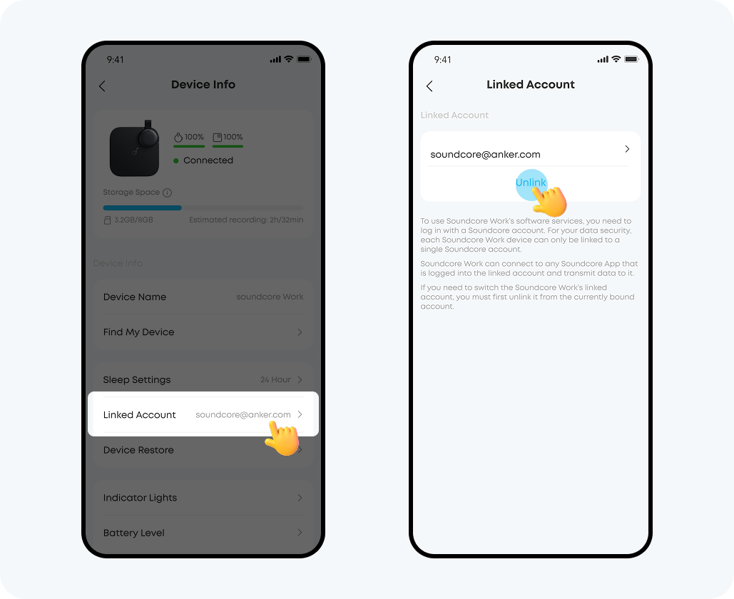 Go to Device Info, click "Linked Account" and then click "Unlink." After unlinking, the device will be unassociated with your account.