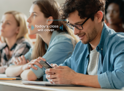 Setup: The lecturer's voice is received by your phone, translated, and streamed directly to your earbuds.