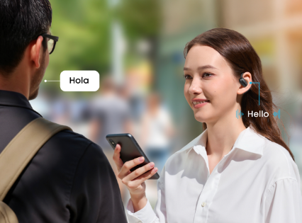 Setup: Your voice is captured by the earbuds, translated, and played through your connected phone. The other person's voice is picked up by your phone's microphone, translated, and delivered to your earbuds.
