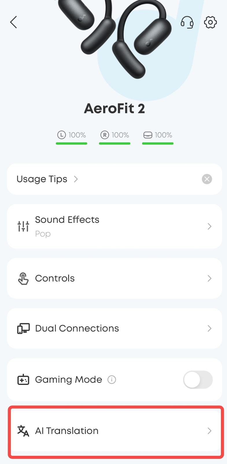 2. Connect the earbuds to your phone and open the app, pair your AeroFit 2 earbuds, and enable the AI Translation feature in the settings.
