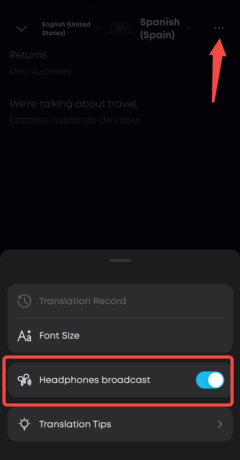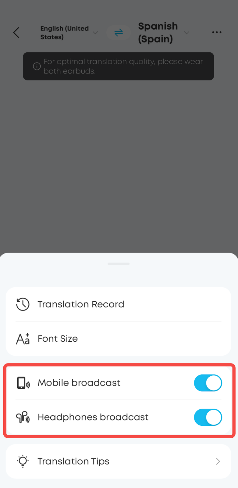 4. Adjust settings: To mute the translation audio, go to "More Settings" (top-right corner) and disable the Mobile broadcast and Headphones broadcast options.
