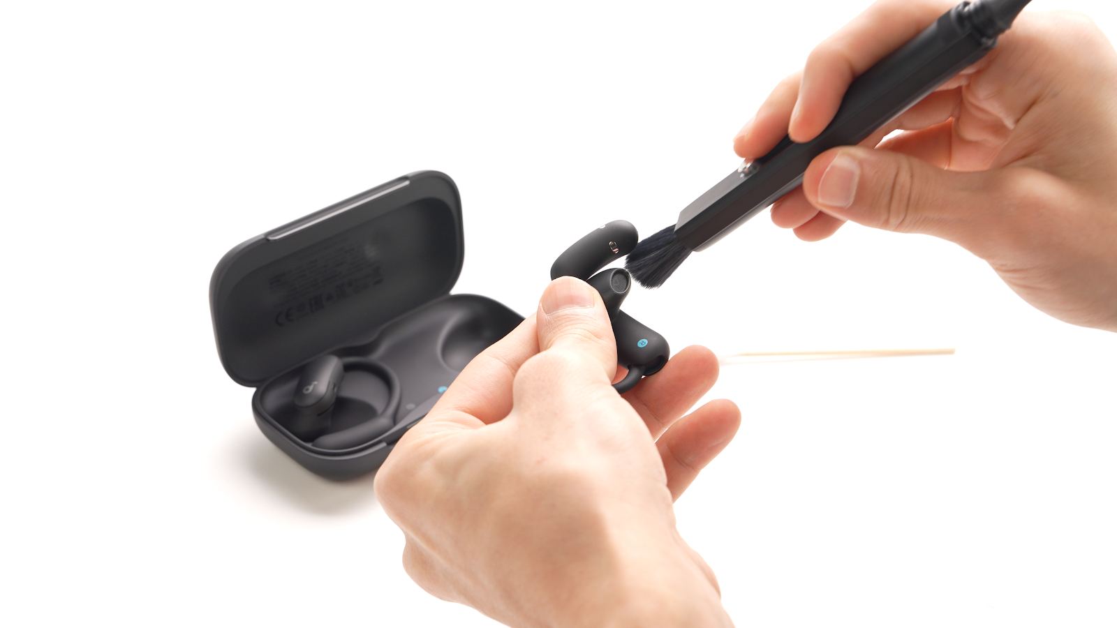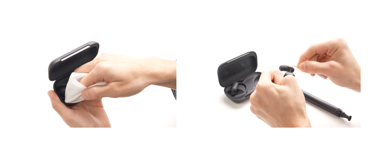After each use, clean the earbuds and charging case with a soft, dry cloth. Use a cotton swab or dry cloth to clean the charging contacts, and use a brush to clean the speaker mesh of the earbuds.