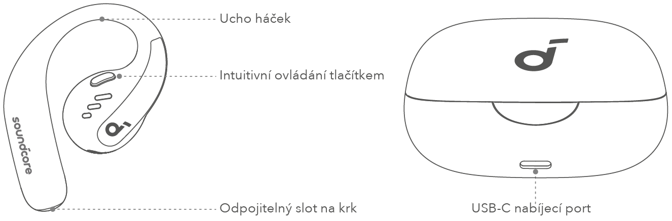 Stisknutím otevřete nabíjecí pouzdro, sluchátka se automaticky zapnou. Pro vypnutí vraťte sluchátka do nabíjecího pouzdra a zavřete jej.