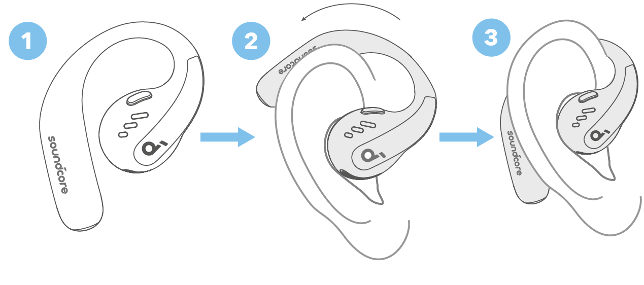 Vyjměte sluchátka z nabíjecího pouzdra a otočte háčky podél ušních boltců, abyste dosáhli správné polohy.