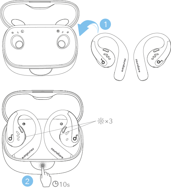 Nejprve na svém zařízení Bluetooth vymažte historii párování. Sluchátka vložte do nabíjecího pouzdra a pouzdro nechte otevřené. Stiskněte tlačítko nabíjecího pouzdra až na doraz a podržte jej po dobu 10 sekund, dokud LED kontrolky na nabíjecím pouzdře třikrát nezablikají.