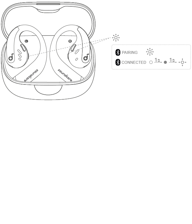 Při párování začnou LED indikátory uvnitř nabíjecího pouzdra blikat. Po úspěšném spárování se LED kontrolky uvnitř nabíjecího pouzdra rozsvítí na dobu 1 sekundy a poté zhasnou. Poté začnou pomalu blikat.